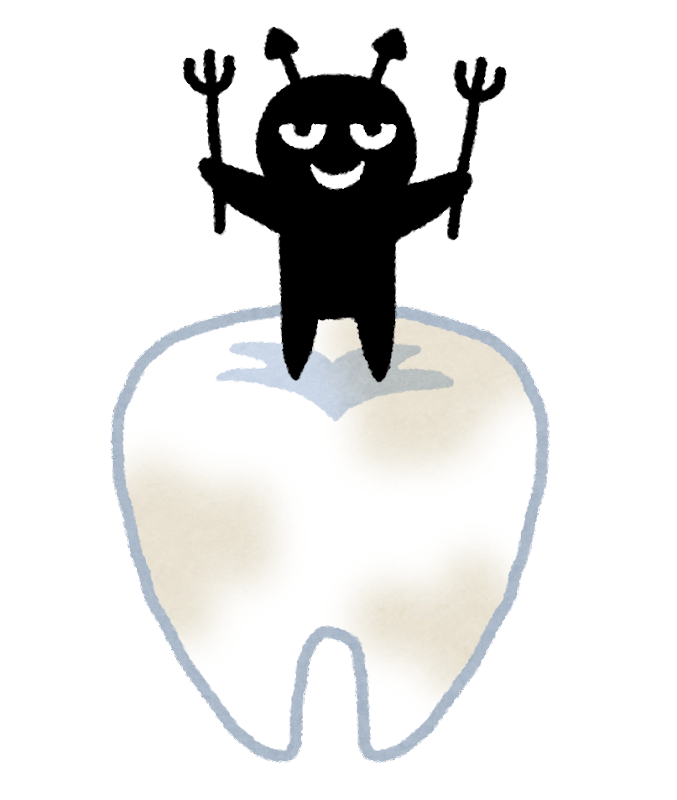 進行にあわせて柔らかい部分が露わになっていくのですが固い組織と比べて色を取り込みやすいため溶けていく際黒色や茶色の組織を取り込み虫歯のところが黒く見えるのです!!