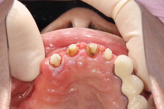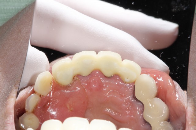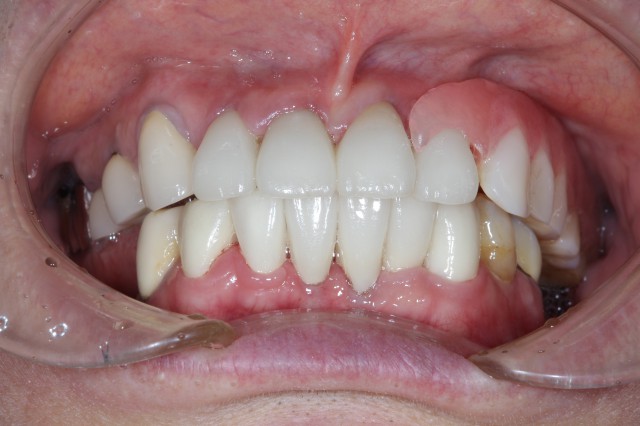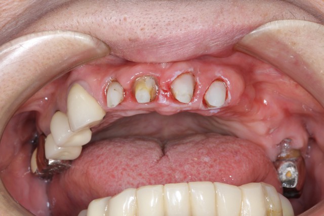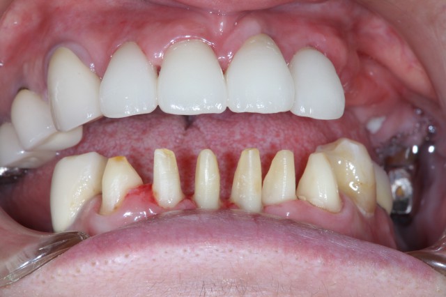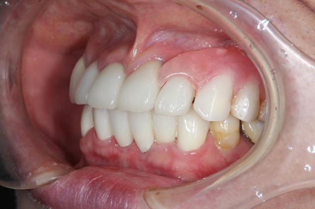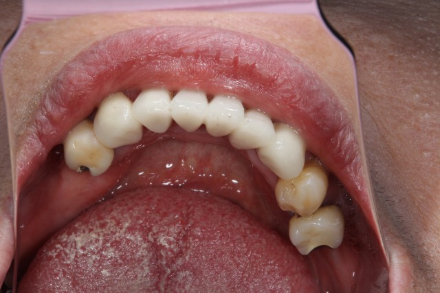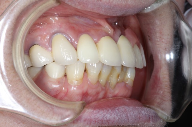 もともと上の前歯にはセラミッククラウンで審美されておられたのですが、付け根に黒ずみができて非常に気にされていました。さらにしたの前歯4本は歯茎が下がってしまっていたので、前歯のセラミッククラウンで審美回復した後に下のは4本も合わせてセラミッククラウンにて審美回復させていただきました。