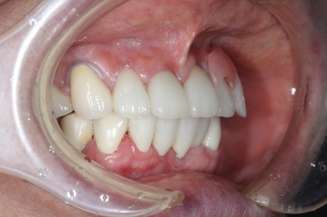差し歯の付け根の黒ずみと歯茎の下がりをセラミッククラウンにて審美回復した症例
