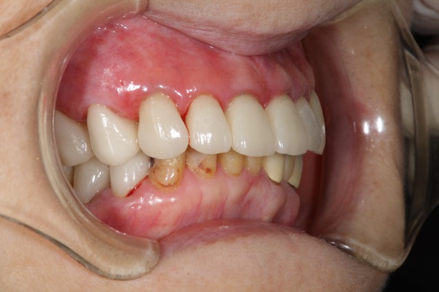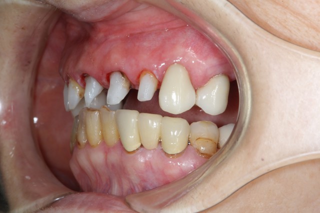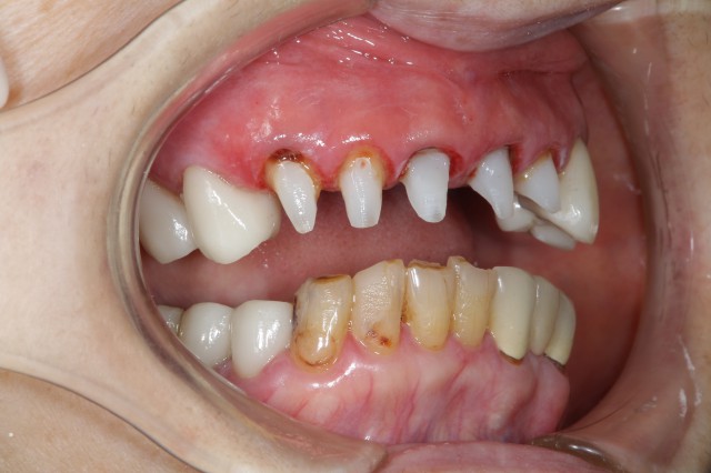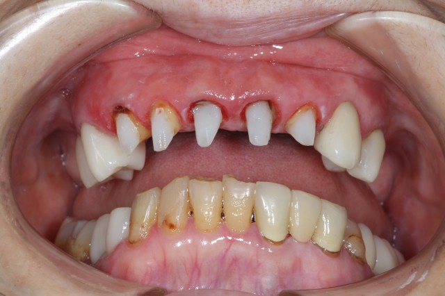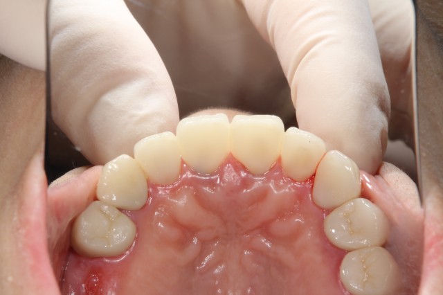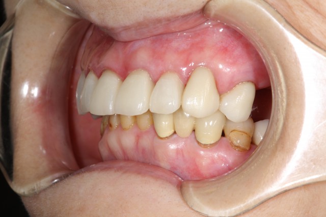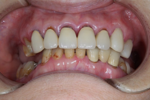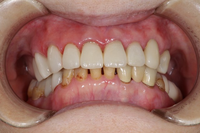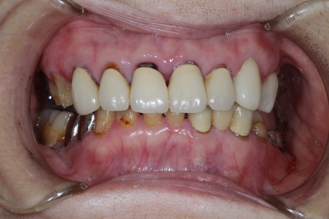 前歯5本がセラミッククラウンによりはめ込まれた状態です。歯茎根元の黒ずみは解消されまわりの歯との色も自然な仕上がりになりました。この黒ずみがなくなったことで大きく口をあけるのに抵抗がなくなったと非常に喜んでおられました。