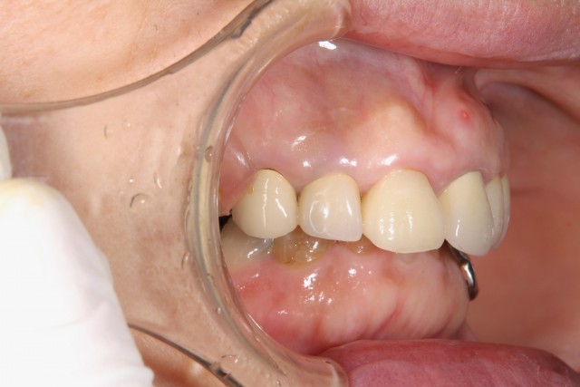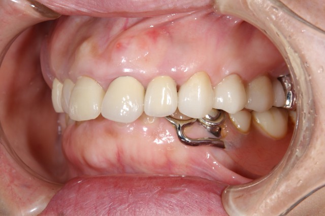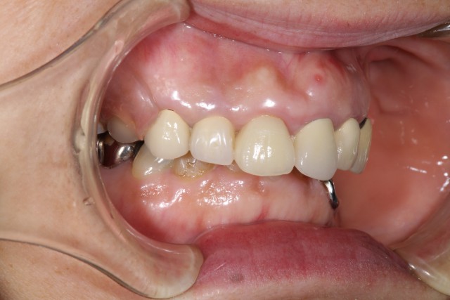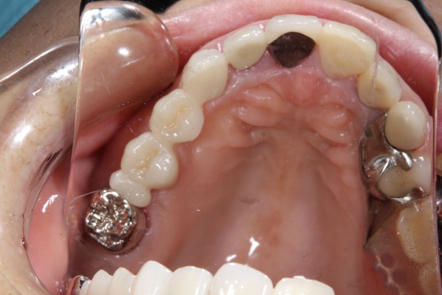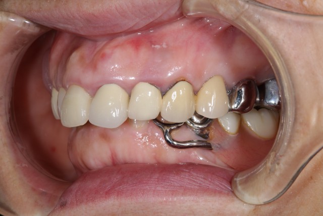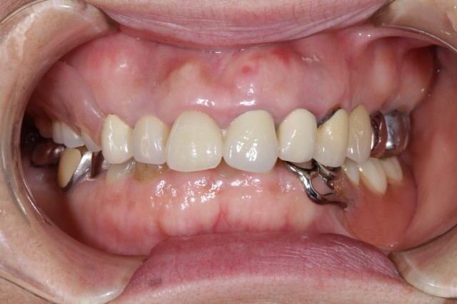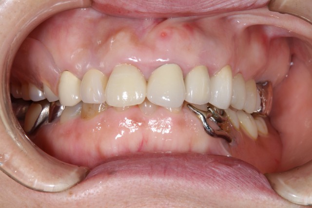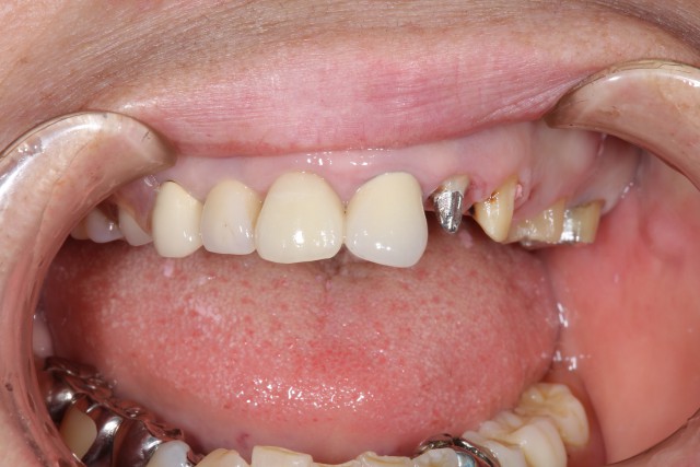 以前に保険内の審美回復を行っておられたのですが、年がたつにつれ歯茎が下がってしまい黒ずみも気になりだしたということでセラミックによる審美回復を行いました。黒ずみが目立つのは1本でしたが、奥歯の銀歯も目立つのでそれらの歯も利用しセラミッククラウンによる審美回復を施術いたしました。