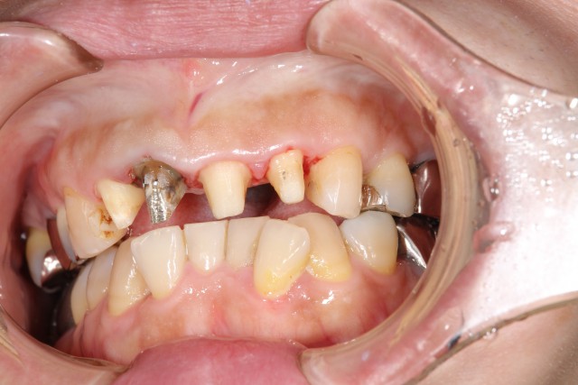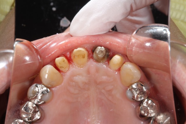 取り付けてあった被せ物を取りのぞき現在の患者様にあった歯の型を取り義歯を制作していきます。