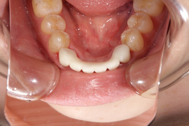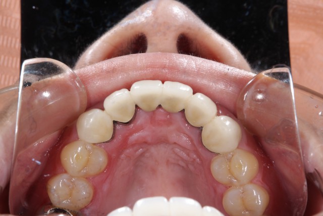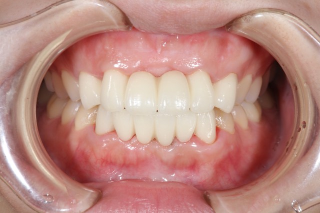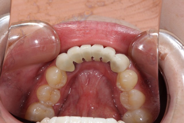 白さを求めるとオールセラミックで施術するのですが、今回の患者様は上前歯2本、下前歯4本が欠損されているためにブリッジ(まわりの歯を使って橋を渡すように被せる術)による施術になります。そのため強度が必要となり今回はジルコニアによる施術をご提案させていただきました。