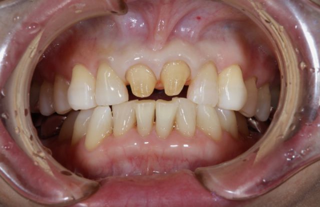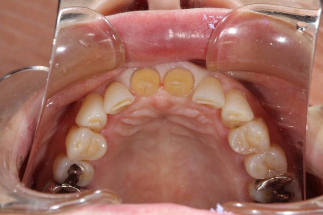 変色した前歯をオールセラミックの被せ物で色味を合わす術例