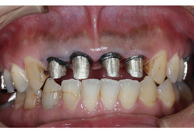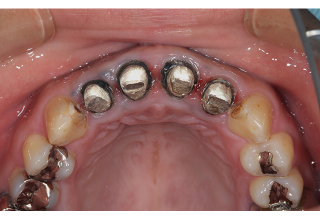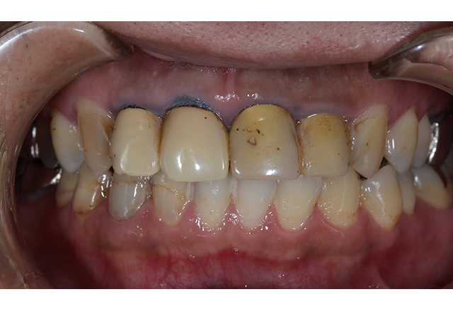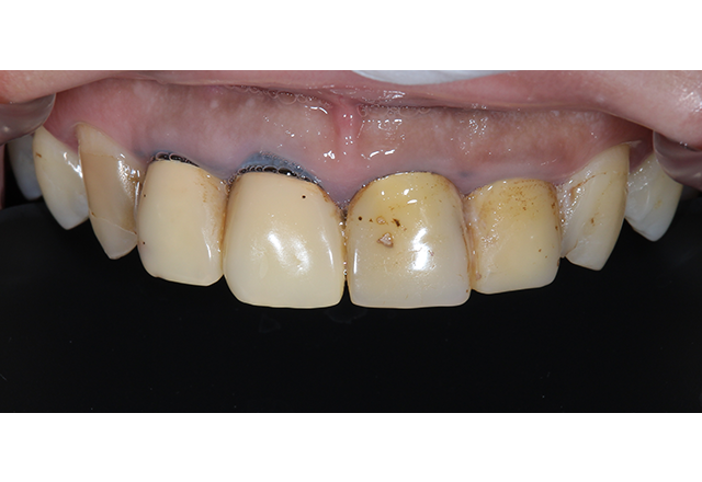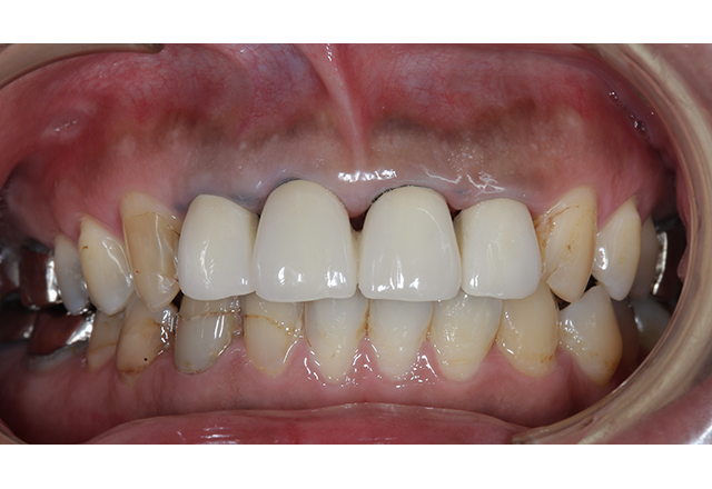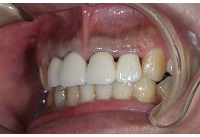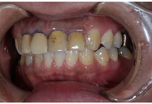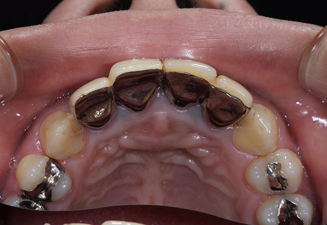 過去に保険により治療した差し歯の着色と歯茎と差し歯の間にできる黒ズミが気になっておられました。自費による治療も考えられていましたが、今回は費用のことも考え保険治療を行われました。