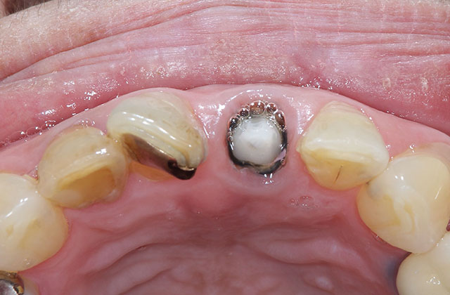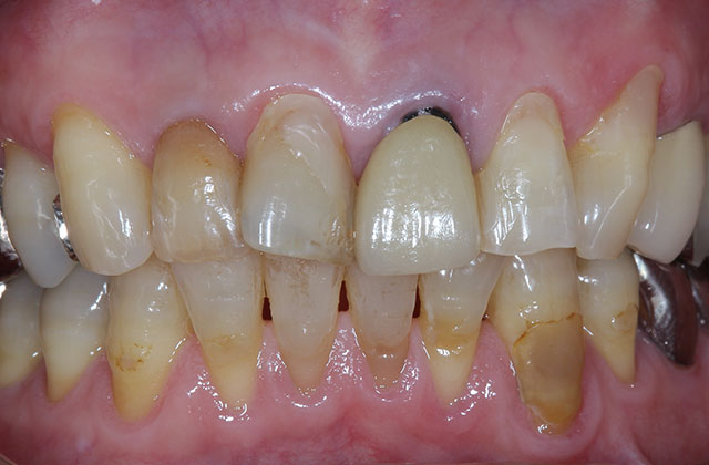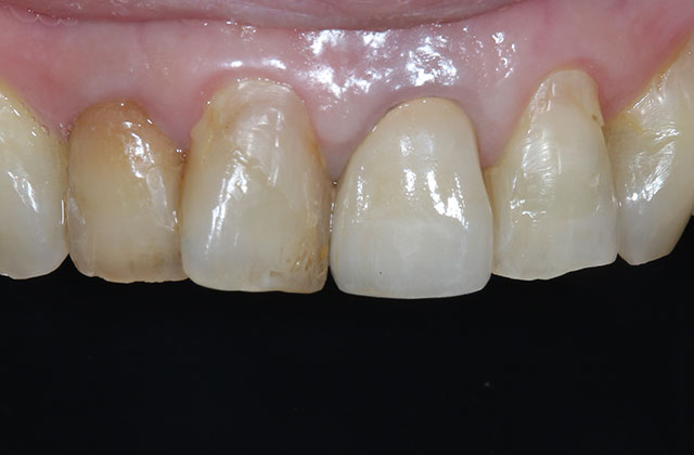 以前に治療した被せものが古くなり、歯茎と歯の間の黒ずみがとても気になるというということで今回オールセラミックによる治療を行いました。