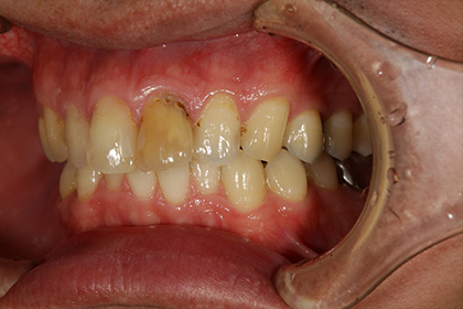 この患者さんは昔歯をぶつけて神経が死んでしまっていたのが変色の原因でした。今回この変色した歯をジルコニアによりまわりの歯と合わせる施術を行いました。