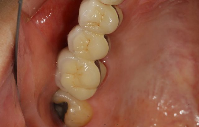施術後です。この部分はかみしめることが多いので強さのあるジルコニアは最適です。また色味もまわりの歯と自然な感じとなっています。ジルコニアは1本12万円(税別)です。今回は3本分の治療となりました。