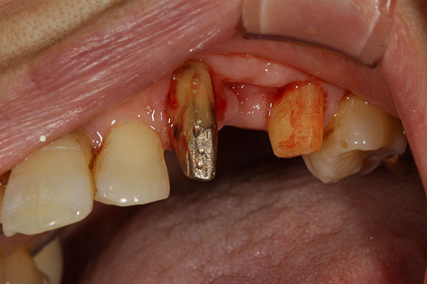 この患者さんはもともと右上犬歯(前歯から数えて3番目)にメタルボンドが入っていましたがそれを今回除去し、犬歯から5番目の小臼歯までを連結したブリッジにしました。