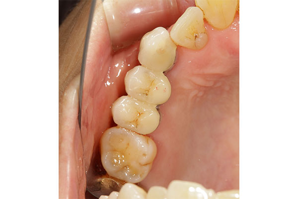 右上小臼歯(前歯から数えて4~5番目)の抜歯後補綴(ほてつ)メタルボンドのブリッジした症例