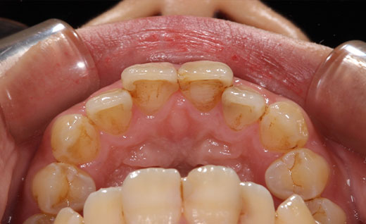 術後です。ホワイトニングをしたので術前に比べ歯は白く明るくなりました。また前歯の虫歯の治療もできるだけ目立たないように心がけ治療を行っております。術前では黒ずみや虫歯後がくっきり見えるのに対して術後ではほとんどわからず自然な見た目となります。