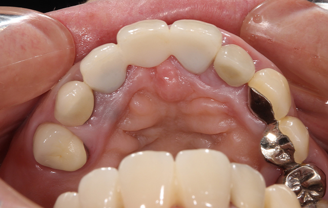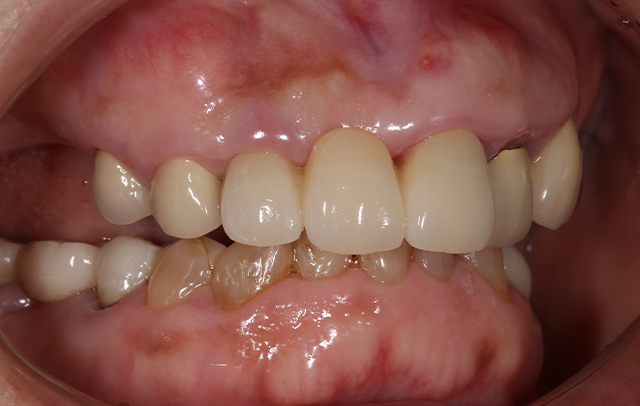 もともと前歯3本をオールセラミックで治療されていましたが、その横の保険適応で治療した歯の色と黒ずみを気にされていました。笑うたびに見えてしまうので、どうしても気になってしまうと悩んでおられました。今回右の2番と左の3番の前歯をオールセラミックでの治療をさせていただきました。